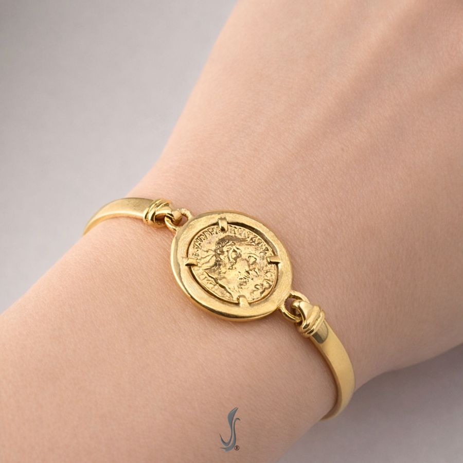 Bracciale rigido in argento 925‰ con finitura dorata, impreziosito da una moneta centrale dal design ispirato all'antichità. Il bracciale presenta un doppio braccio rigido con chiusura a moschettone, solido e pratico, perfetto per completare con stile e personalità ogni look. Un gioiello che rievoca il fascino della storia e dell'artigianato classico.