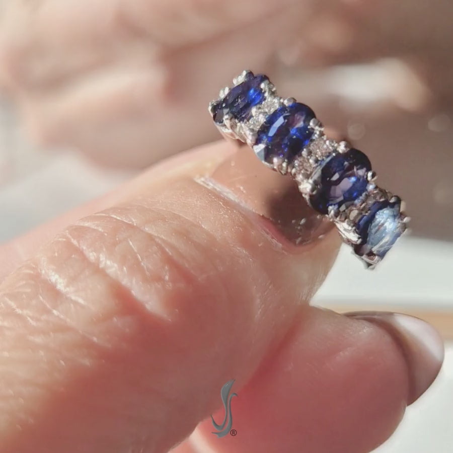 Un classico intramontabile della gioielleria reinterpretato con gusto moderno. Questo anello in oro bianco 750‰ è interamente realizzato a mano nei laboratori Vicari Gioielli, con una composizione di cinque zaffiri blu ovali, alternati da diamanti bianchi taglio brillante, per un effetto di luce continua e profonda intensità cromatica.