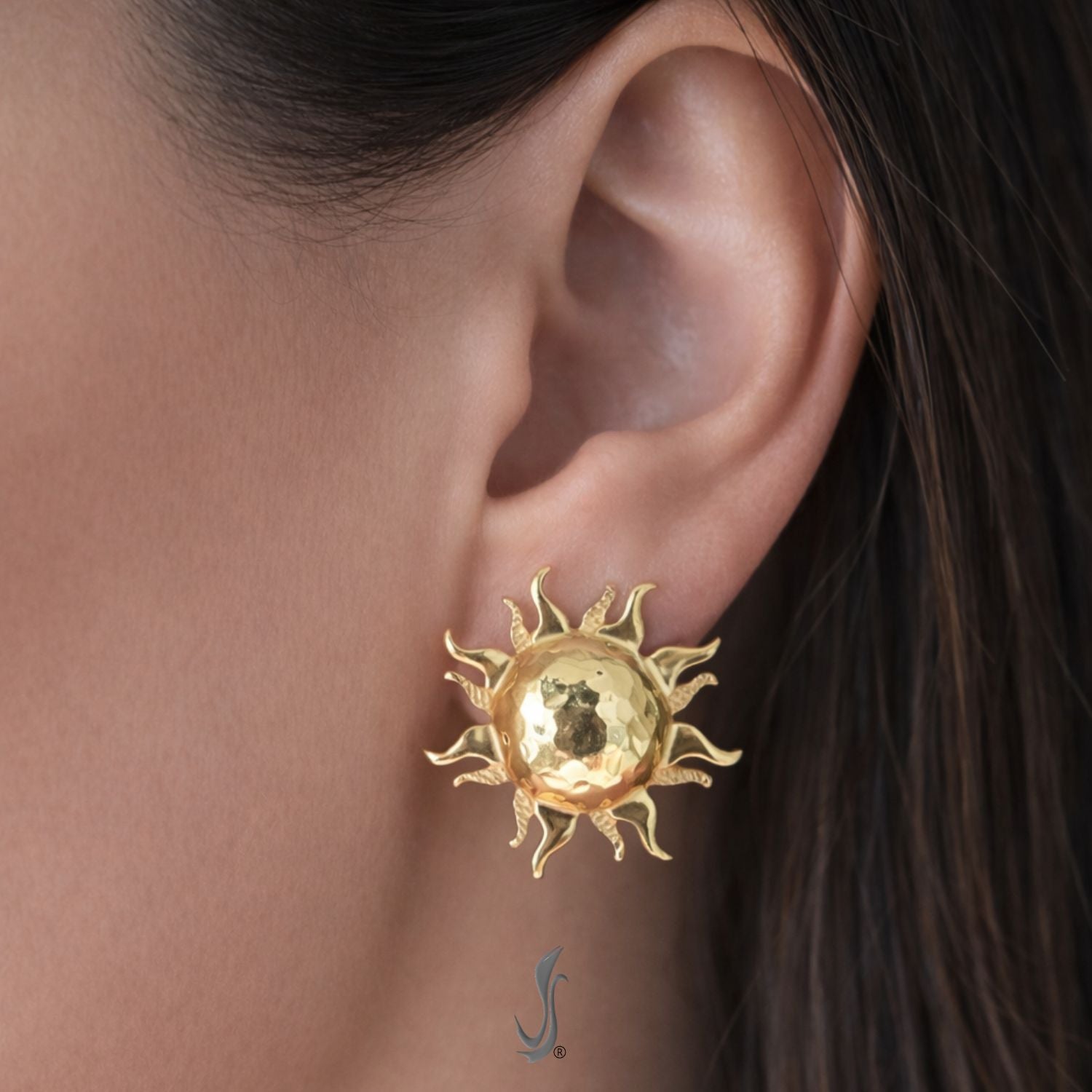 Orecchini in argento "Sole di Sicilia". Realizzati in argento 925°°° raffigurano un sole con sfaccettatura luminosa. La chiusura dell'orecchino è con perni e clips ed il diametro totale, compresi i raggi, è di 25mm. Le collaborazioni dell'argento disponibili sono tre: Bianco, dorato e rosa. Nati da un' idea e realizzati a mano da maestri orafi nei Laboratori Artigianali Vicari Gioielli.
