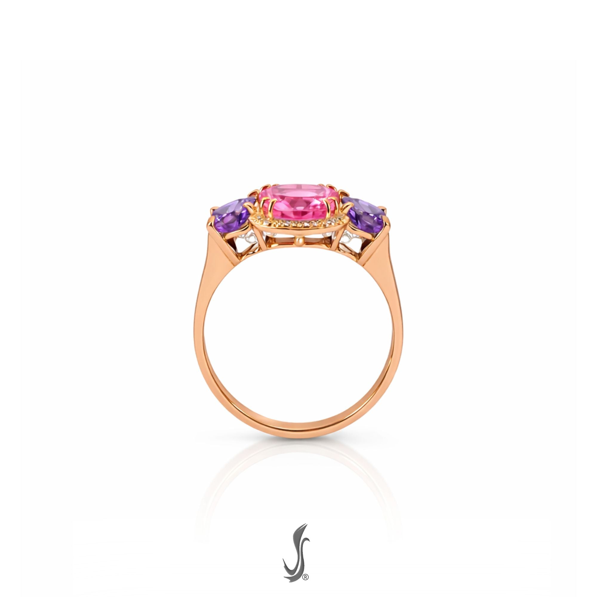 La pietra centrale, dalle intense tonalità rosa, è valorizzata da un delicato contorno di diamanti taglio brillante, che aggiungono luce e raffinatezza al design. Le ametiste laterali, con il loro colore viola intenso, creano un contrasto armonioso che rende il gioiello raffinato e distintivo.